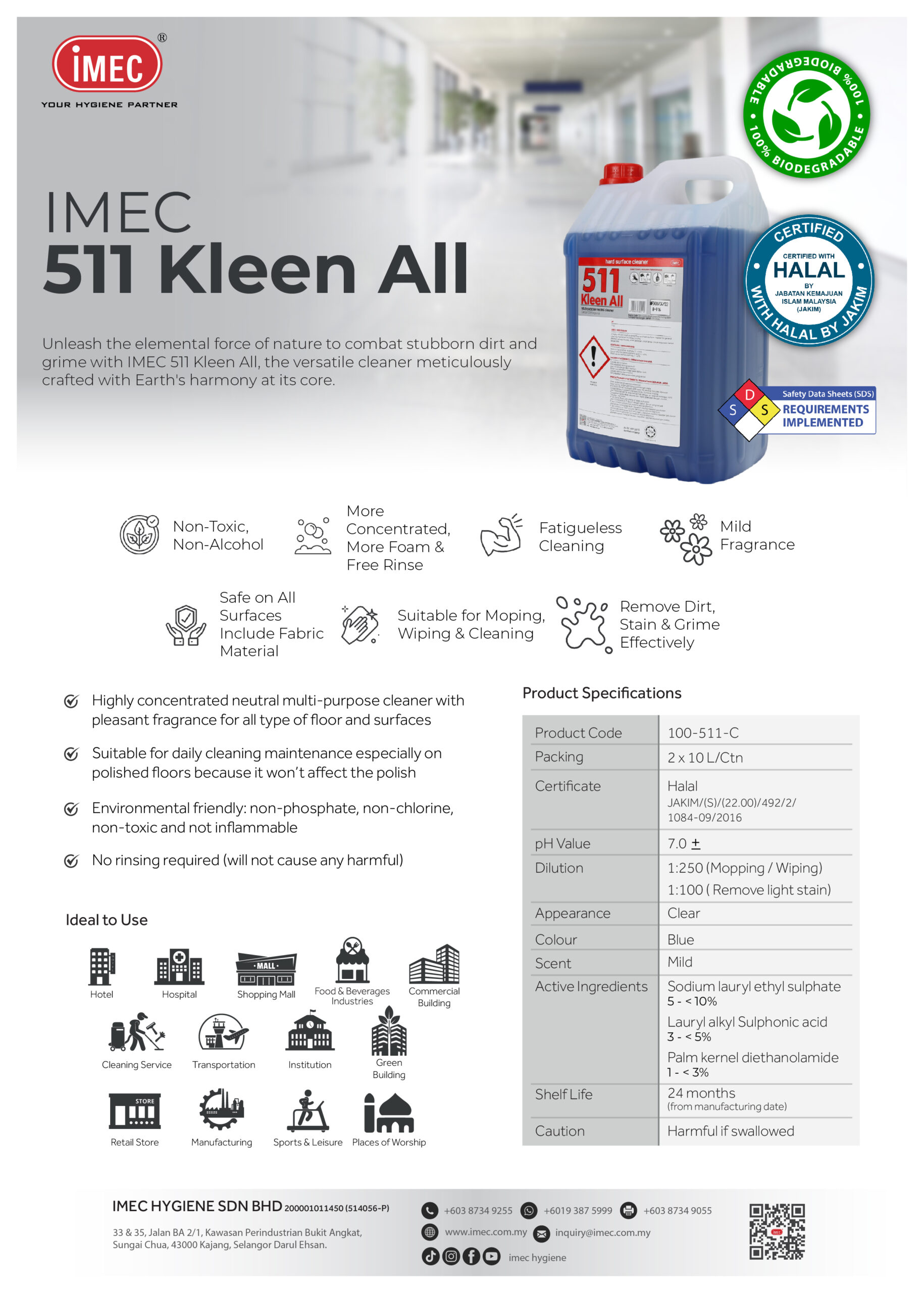IMEC 511 Kleen All, Multipurpose Cleaner, Halal, 2 x 10L