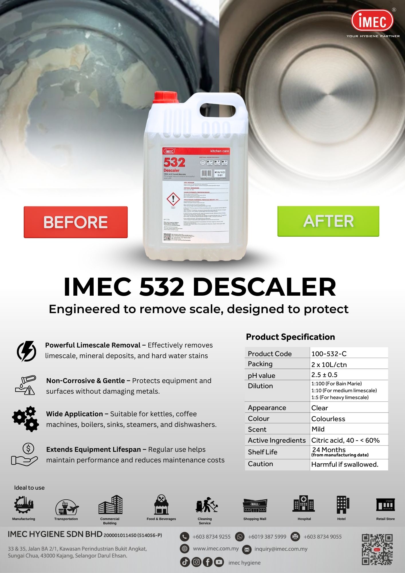 IMEC 532 Descaler is a food-safe solution formulated with high-purity citric acid to effectively