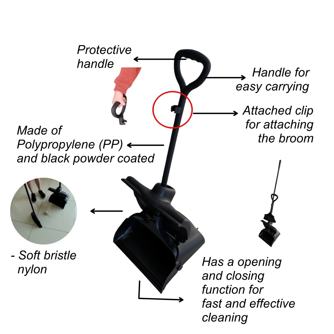 - Long handle dust pan removes the need to bend down preventing obstructions and unnecessary back strain