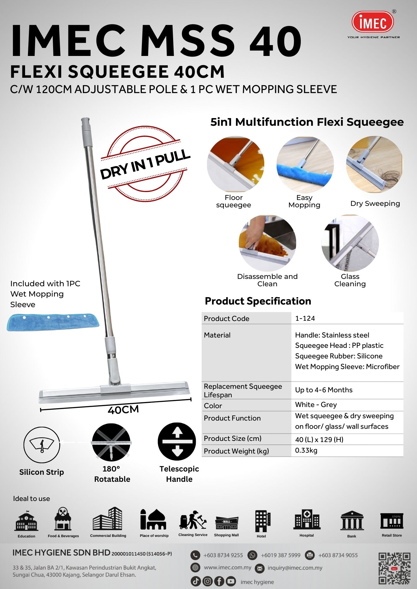 IMEC MSS 40 Flexi Squeegee 40cm is a practical and efficient floor cleaning tool designed for commercial, industrial, and home use. This complete cleaning set comes with a 40cm flexible squeegee, 120cm adjustable pole, and 1pc wet mopping sleeve, making it ideal for daily wet cleaning and water removal.