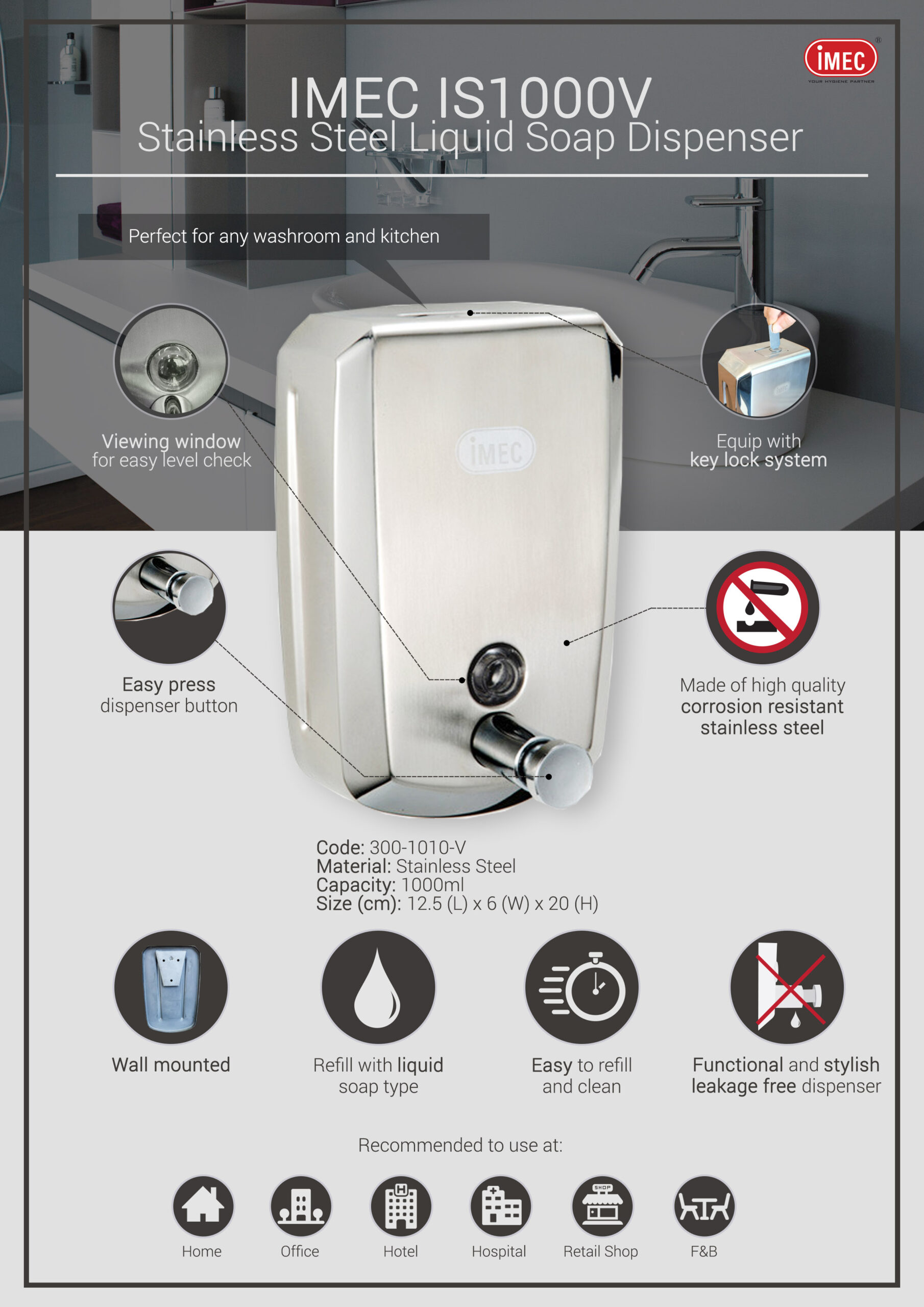 IMEC IS1000V – Refillable Liquid Soap Stainless Steel Dispenser