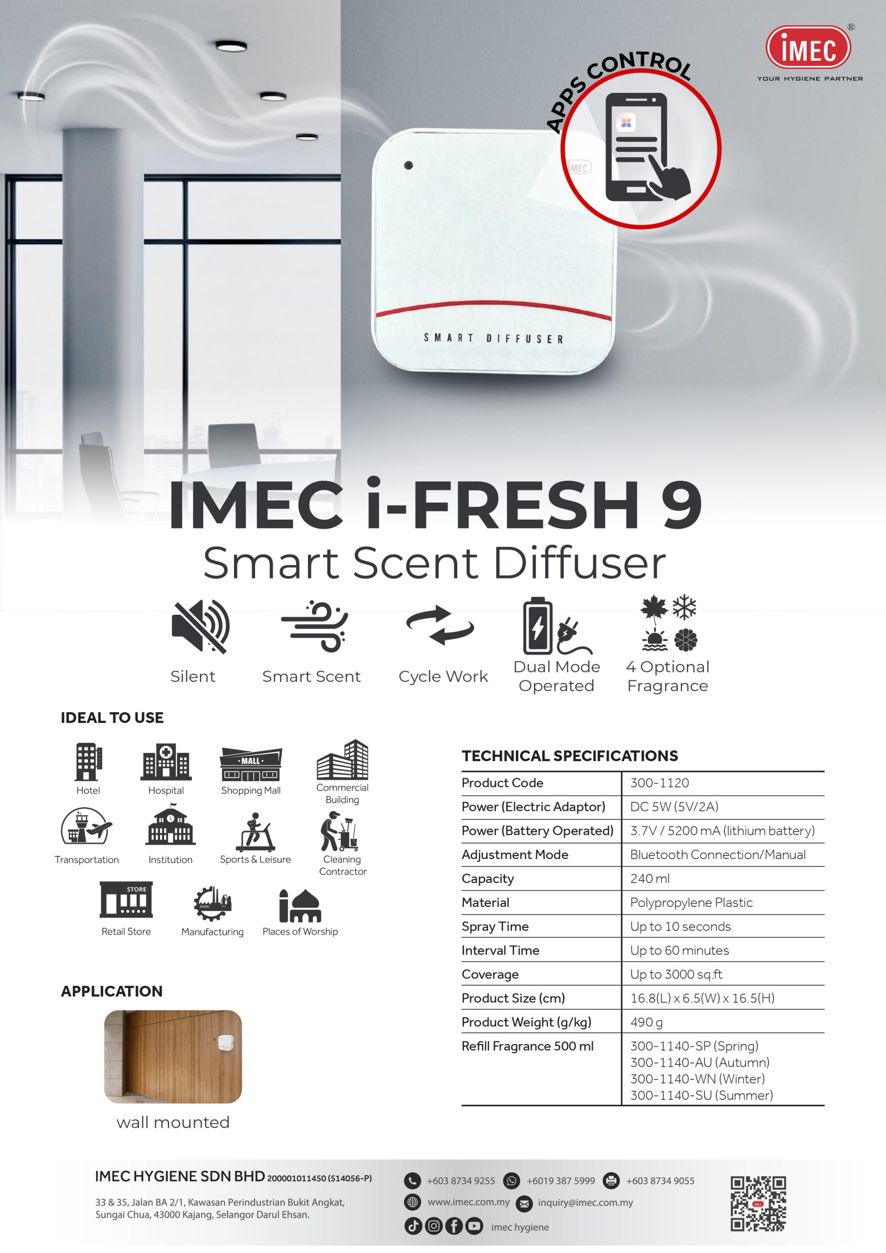 The IMEC i-FRESH 9 is a modern scenting solution designed to enhance indoor environments with consistent and pleasant fragrance. Built for commercial and professional use, this device delivers silent operation, making it ideal for spaces where comfort and ambiance matter, such as hotels, offices, retail stores, and healthcare facilities.