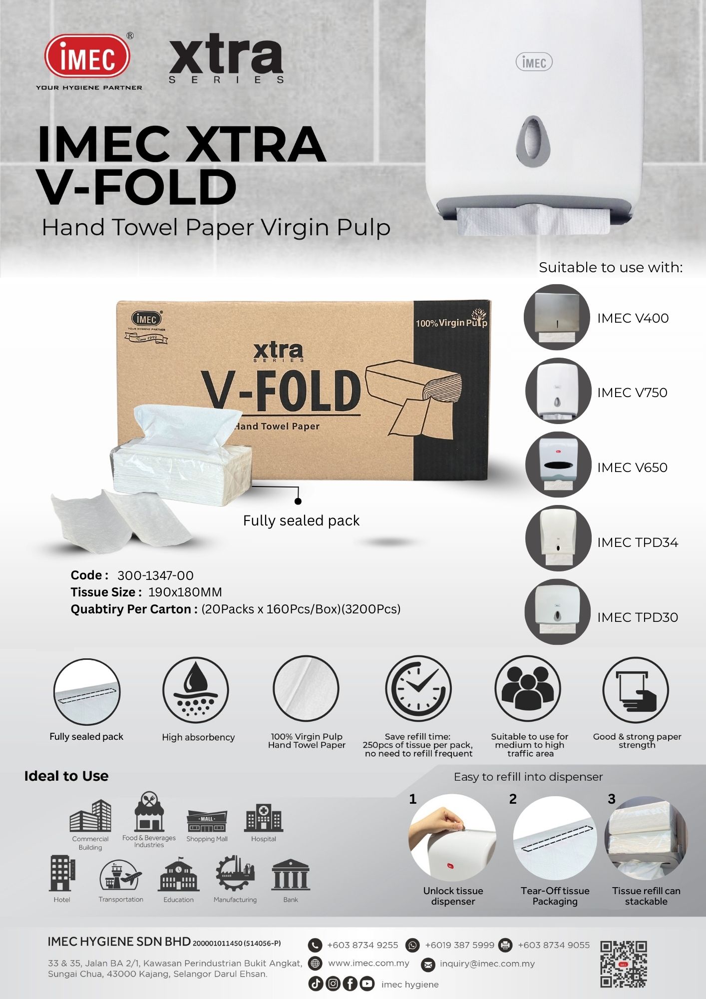 IMEC XTRA V-Fold Hand Towel Paper | Virgin Pulp 200×180mm | (20Packs x 160Pcs/Box)(3200Pcs)